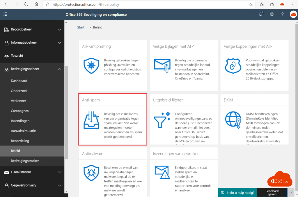 Surf naar protection.office.com / Exchange Online Control Panel