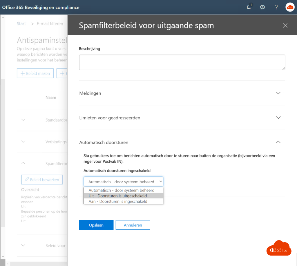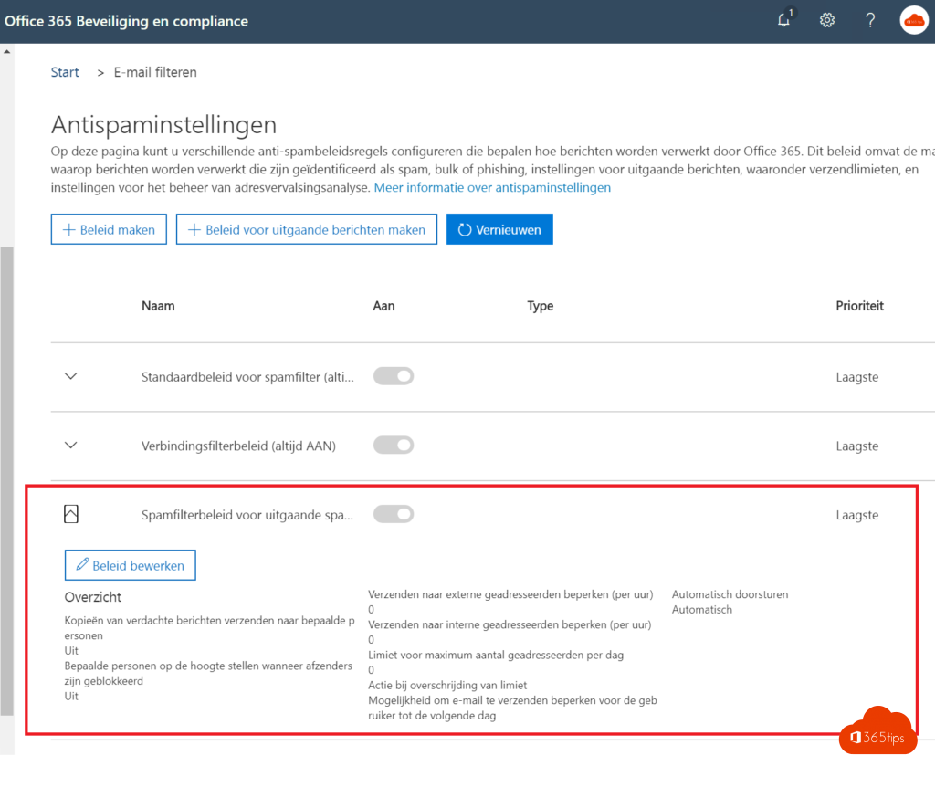 Op deze pagina kunt u verschillende anti-spambeleidsregels configureren die bepalen hoe berichten worden verwerkt door Office 365. Dit beleid omvat de manier waarop berichten worden verwerkt die zijn geïdentificeerd als spam, bulk of phishing, instellingen voor uitgaande berichten, waaronder verzendlimieten, en instellingen voor het beheer van adresvervalsingsanalyse. Meer informatie over antispaminstellingen