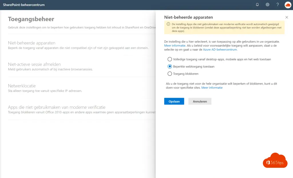 In het SharePoint portaal heb je de mogelijkheid om bij Policies – Toegangsbeheer – Niet-beheerde apparaten deze 3 opties te kiezen:
