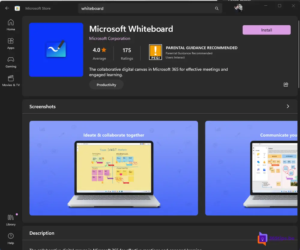 - Microsoft Whiteboard: Een virtueel whiteboard waar teams ideeën kunnen uitwerken, samenwerken en visuele concepten tot leven kunnen brengen.