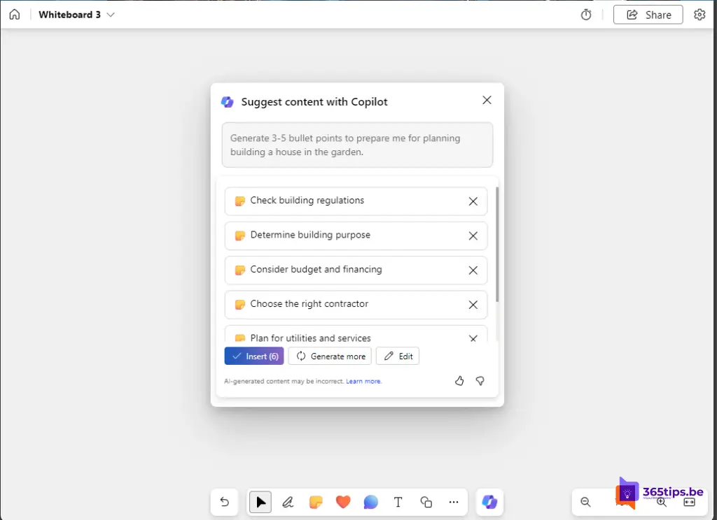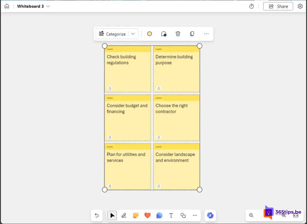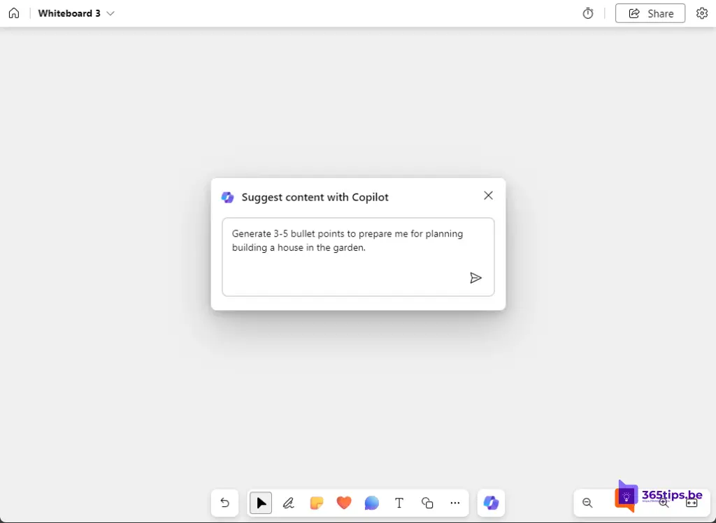 Begin met typen op je whiteboard en laat Copilot je woorden aanvullen terwijl je ideeën vastlegt. Het kan dienen als een snelle suggestiebron om je gedachten te articuleren.