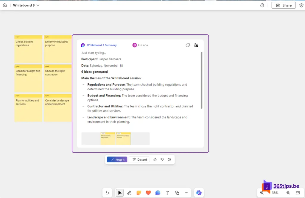 Terwijl je typt op het whiteboard, laat Copilot je teksten aanvullen en verrijken. Het kan helpen bij het formuleren van gedachten en het toevoegen van diepgang aan je ideeën.