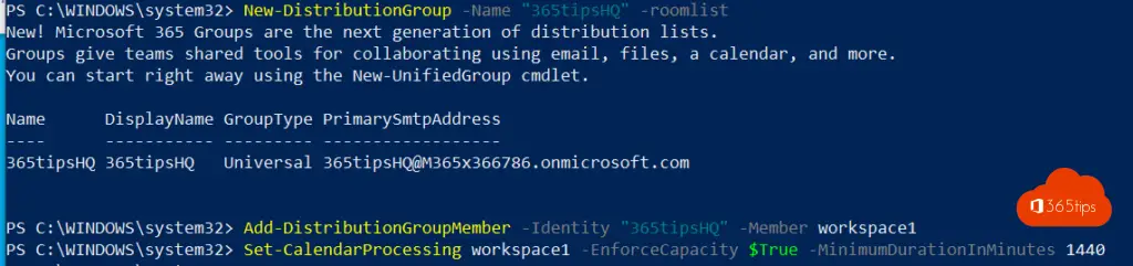 New-DistributionGroup -Name "365tipsHQ" -roomlist