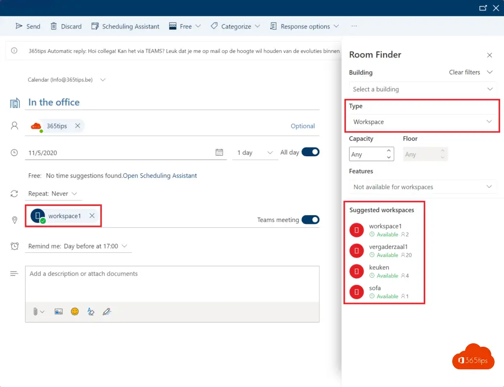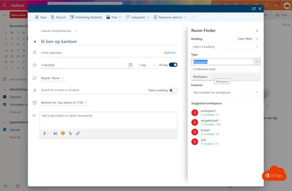 Als je een nieuwe vergadering boekt heb je aan de rechterkant de mogelijkheid om types te kiezen. Kies hier Workspaces. (werkplaatsen)