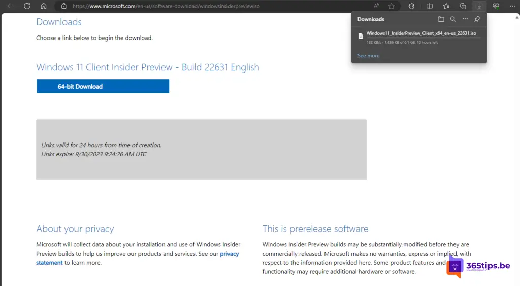 Je kan ook de ISO zelf downloaden. Navigeer naar: Download Windows Insider Preview ISO (microsoft.com) en kies onderaan om versie 22631 te downloaden.