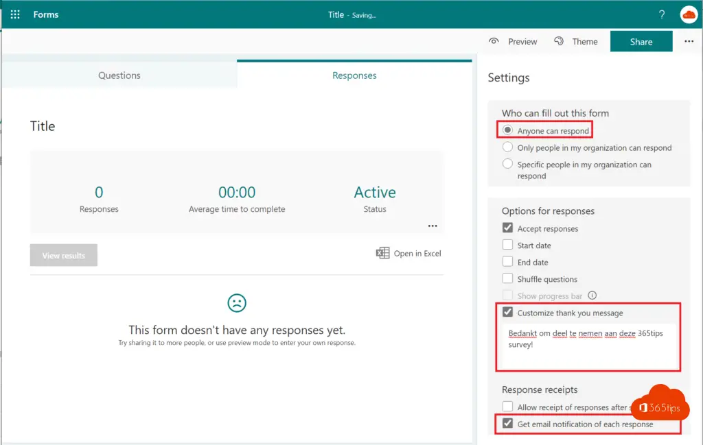Als je de selectie maakt ‘Anyone can respond’ kunnen externe gebruikers deze enquête beantwoorden.