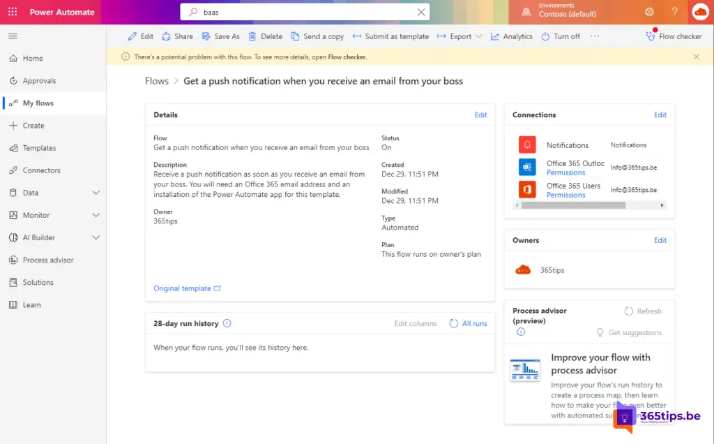 Surf naar: https://make.powerautomate.com – Zoek naar de gewenste flow. In dit geval gebruiken we de flow die een notificatie aanmaakt als de e-mail van een specifiek persoon is.