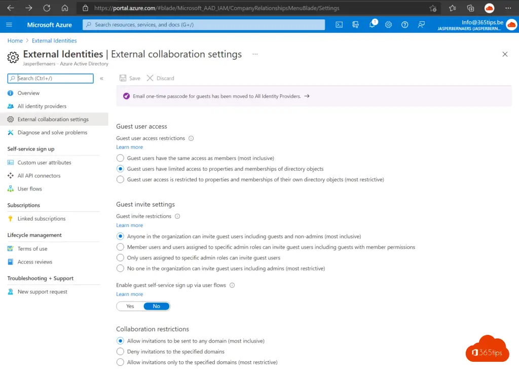 Navigeer naar het Azure Paneel voor Externe identiteiten -> https://portal.azure.com/#blade/Microsoft_AAD_IAM/CompanyRelationshipsMenuBlade/Settings