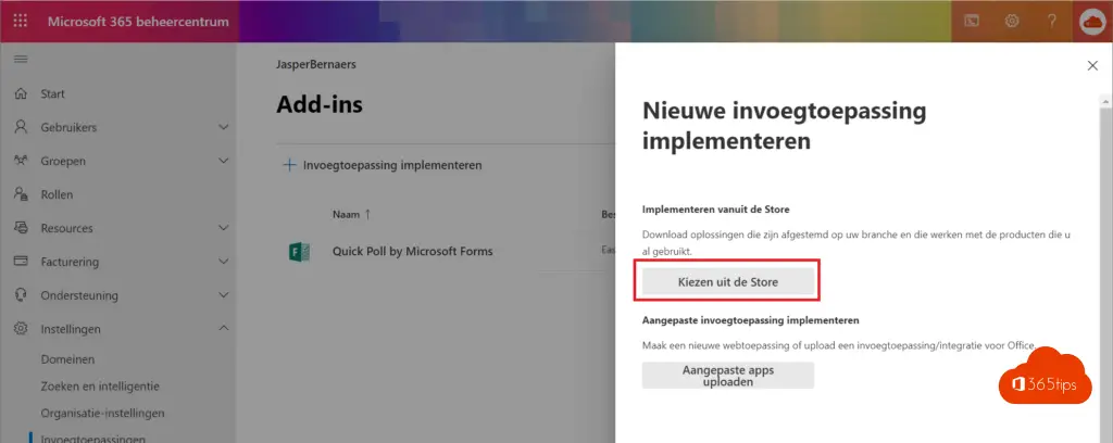 Navigeer naar https://admin.microsoft.com (of gebruik dit overzicht) – druk op invoegtoepassingen onder instellingen.