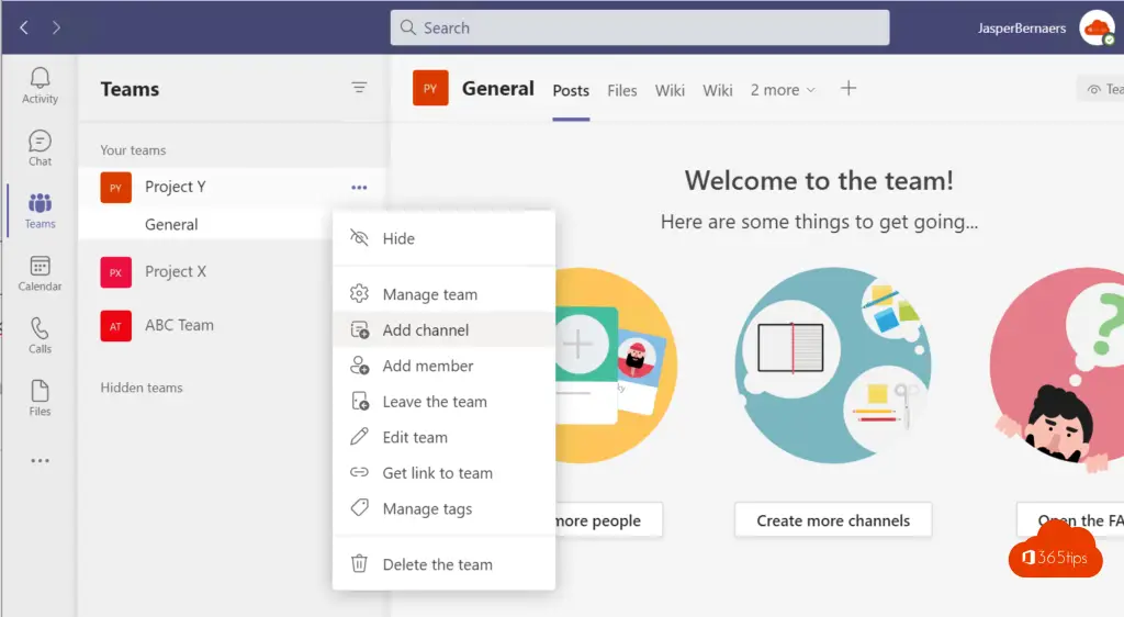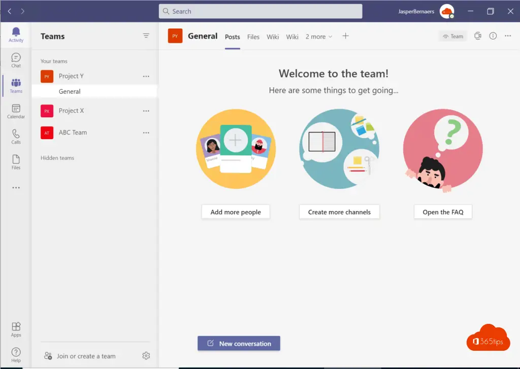 Je nieuw team is opgericht. Leuk. Ik maakte het “Project Y” team aan. Dit team heeft geen specifieke instellingen en is standaard ingericht.