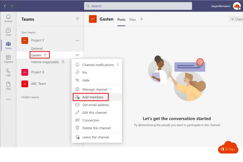 Als je gasten wil toevoegen aan een privékanaal moeten zij altijd toegang hebben tot het globale team. In dit geval: Project Y. Dit betekend dus ook dat gasten in het algemeen kanaal kunnen rondkijken. Wil je dat? (Ik denk van niet)