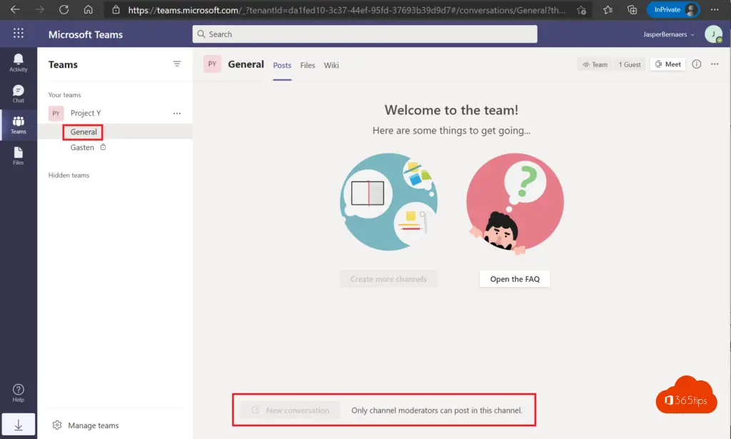 Gasten kunnen by-default posten in het algemeen kanaal. Indien je dit wenst te blokkeren volg dan deze stappen. Deze tip kan helpen om te voorkomen dat gasten berichten kunnen plaatsen op kanalen die niet bestemd zijn hiervoor.
