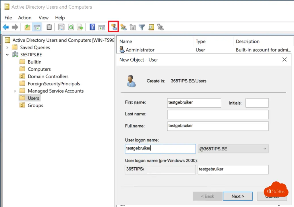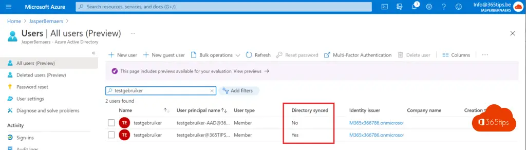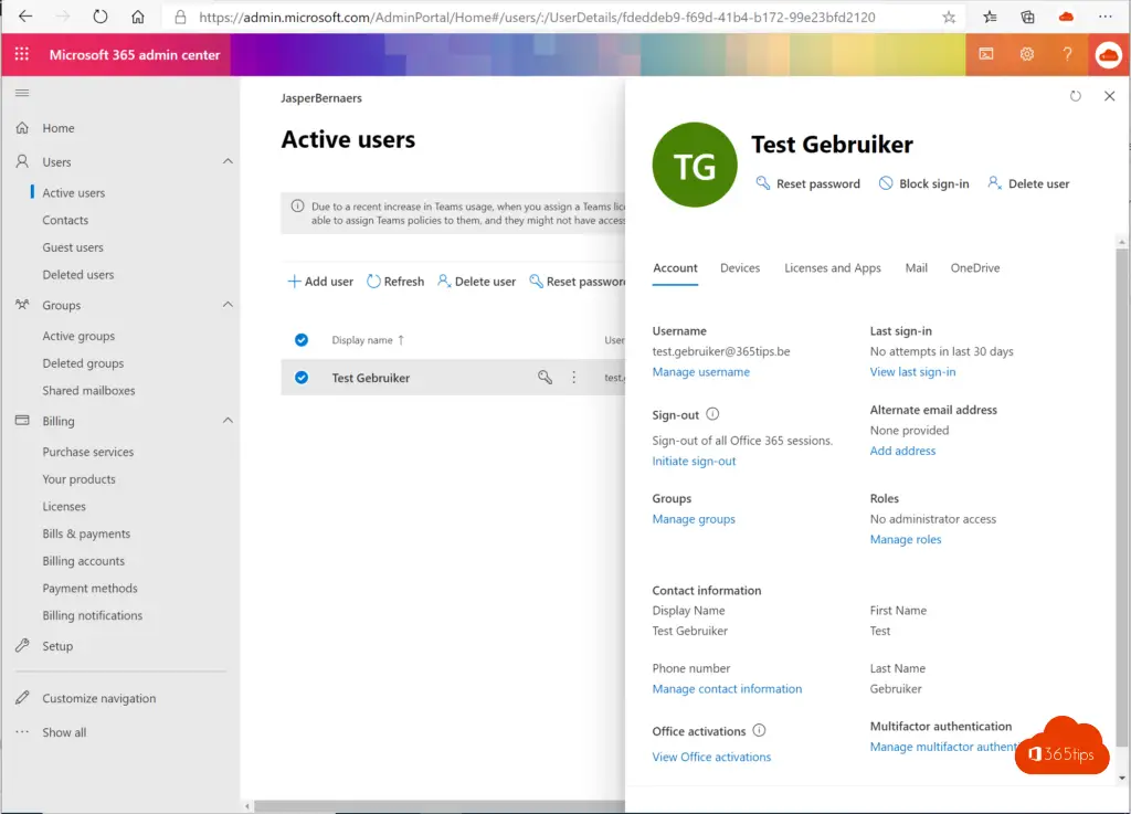 - Ofwel via Active Directory testgebruiker@365tips.be