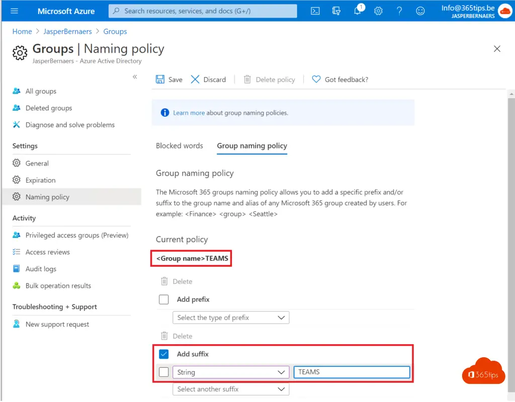 - Naming policy en expiration policies: Het is handiger om automatische policies te activeren in Azure AD dan in Active Directory. Een screenshot hieronder. Praktische gids, hier.