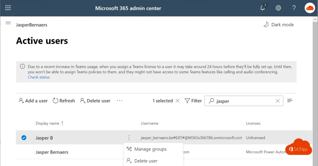 Gasten kan je ook verwijderen via het gewone Office 365 portaal.
