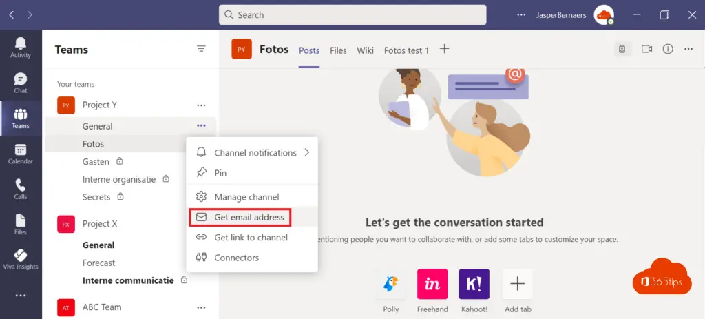 Klik op meer opties -> Selecteer e-mailadressen ophalen om e-mails te sturen naar een Teams-kanaal.