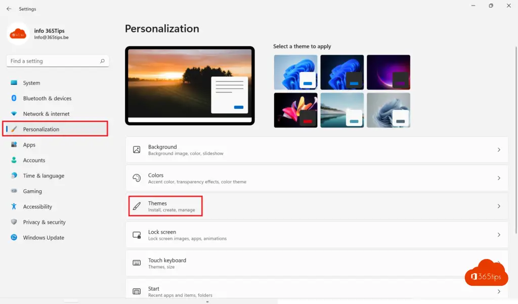Windows 11 wordt geleverd met verschillende vooraf geladen thema’s. Er is een officieel donker thema, maar ook een Glow en Captured thema.