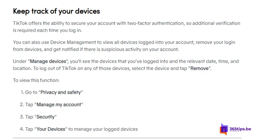 TikTok biedt geen MFA formule aan maar geeft wel de mogelijkheid om met vertrouwde apparaten te werken. Dit geeft vaak een grotere zekerheid omdat je vaak maar één toestel heb.