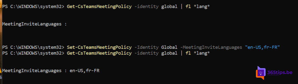 Set-CsTeamsMeetingPolicy -Identity Global -MeetingInviteLanguages "en-US,fr-FR"
