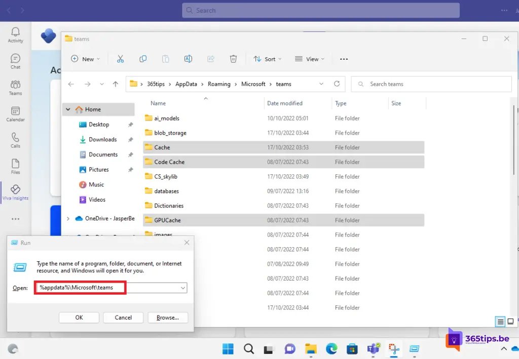 Navigeer bij Uitvoeren in Windows naar de Teams cache bestanden