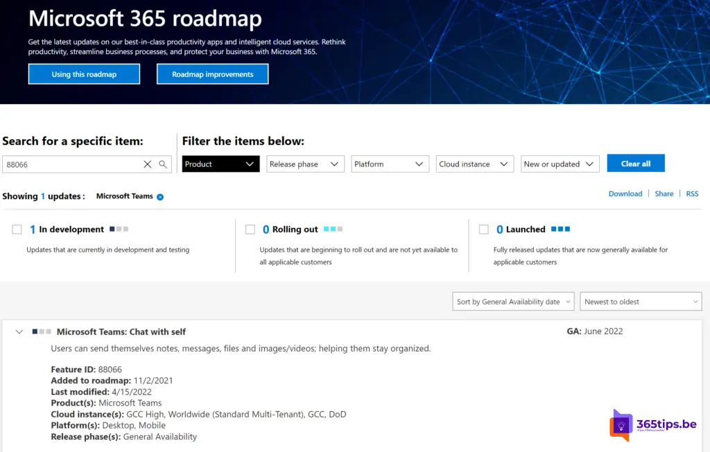 In deze Microsoft 365 roadmap kan je informatie raadplegen over Microsoft Teams maar ook over: Excel, Microsoft Edge, Forms, OneDrive, Stream, Visio, Whiteboard, etc. Bekijk zeker deze pagina: Microsoft 365 Roadmap | Microsoft 365.