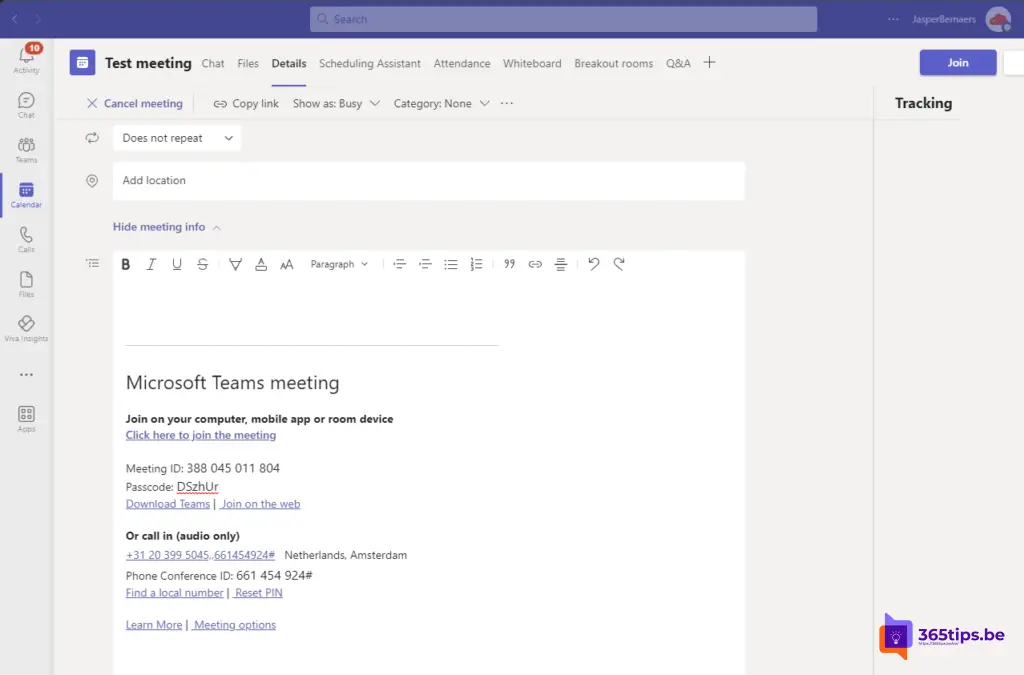 Maak een vergadering aan en druk vervolgens onderaan op: Meeting opties.