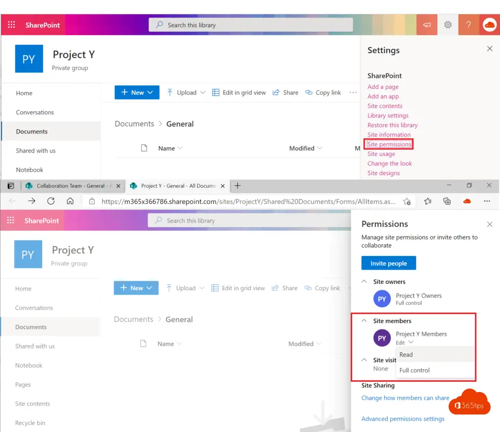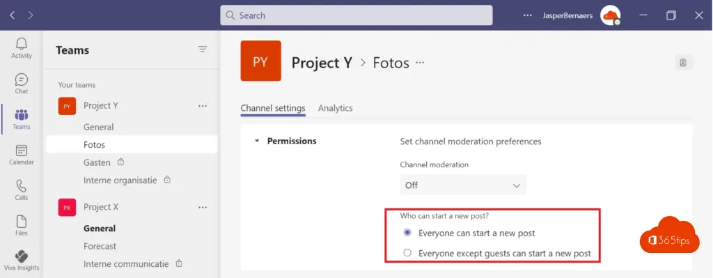 Deze leden kunnen geen documenten plaatsen in het algemeen team. De eigenaars voor Project Y kunnen wel documenten plaatsen in het algemeen kanaal. Je kan ook specifieke rechten geven zodat sommige dit wel mogen zonder dat ze eigenaar zijn van het team.