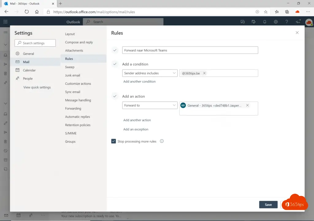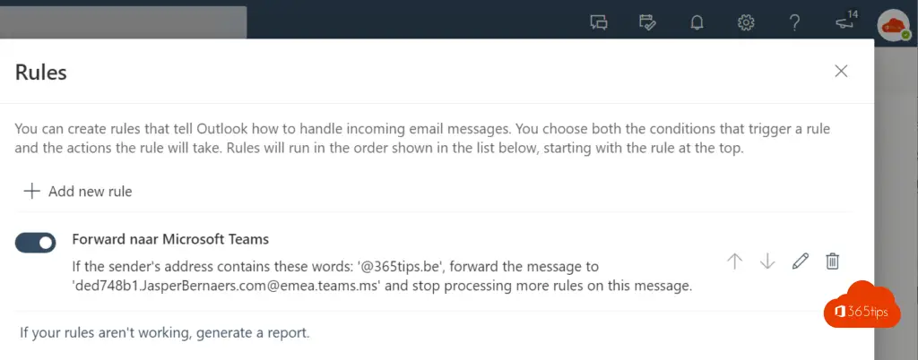 Voeg een conditie toe: Als het sender adres (de afzender) het e-mail adres van je organisatie bevat. In dit geval @365tips.be