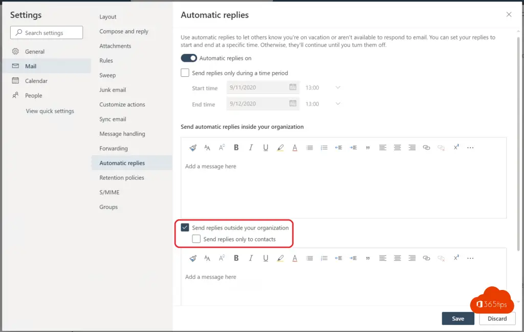 Surf naar: https://outlook.office.com/mail/options/mail/automaticReplies