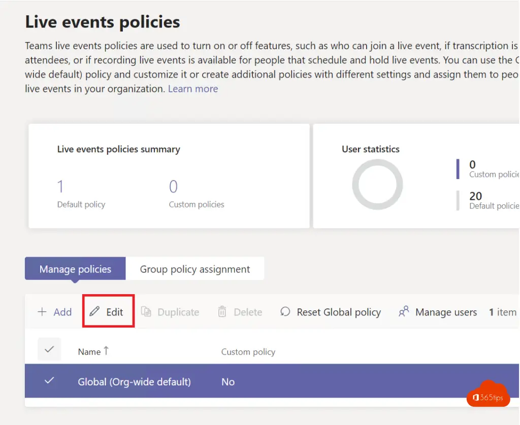 Navigeer naar: Live events policies – Microsoft Teams admin center