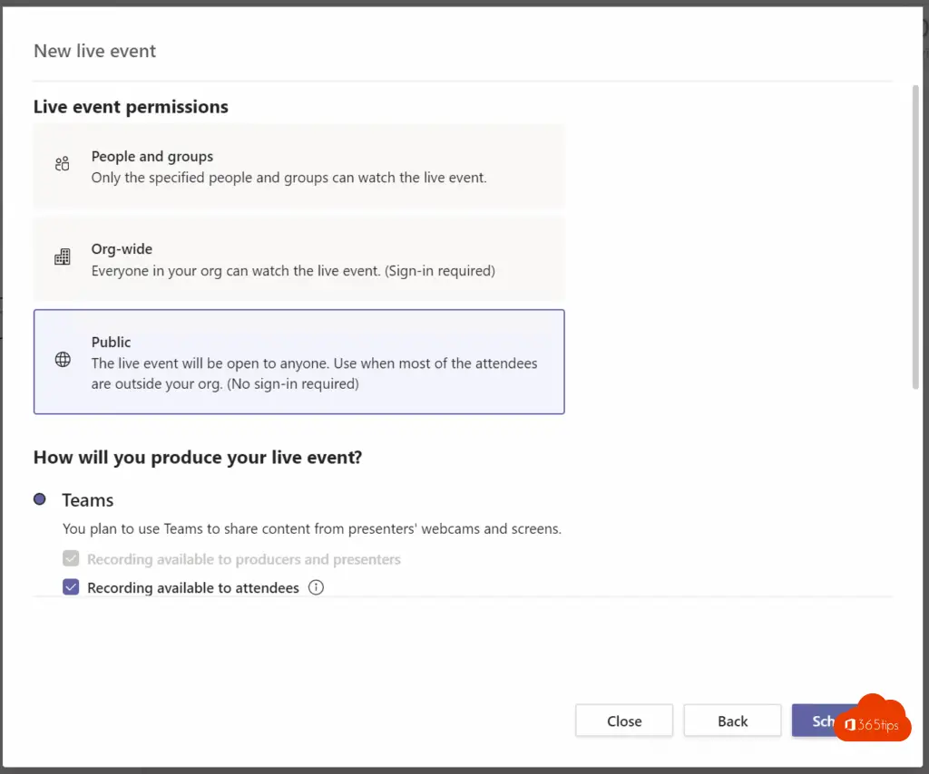 Krijg je de melding: Unable to schedule a “Public” Live event in Microsoft Teams