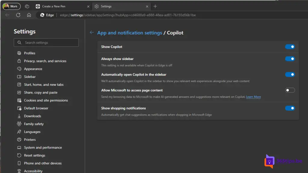 - Schakel de optie Laat Copilot in Windows inhoud van Microsoft Edge gebruiken in.