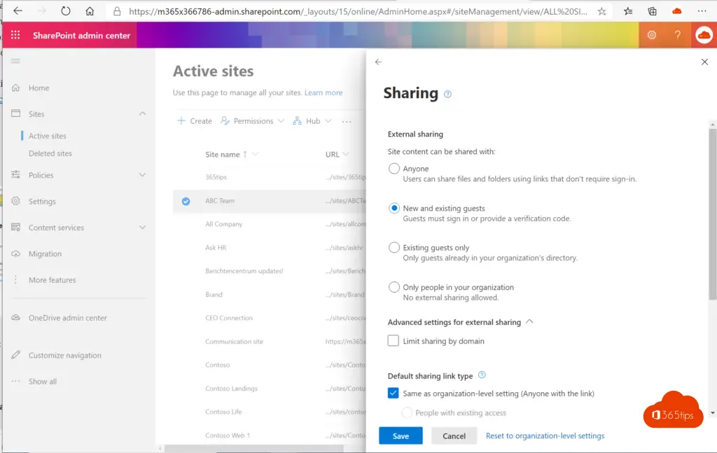 - Surf naar het SharePoint administrator paneel vanuit het admin center. https://admin.microsoft.com