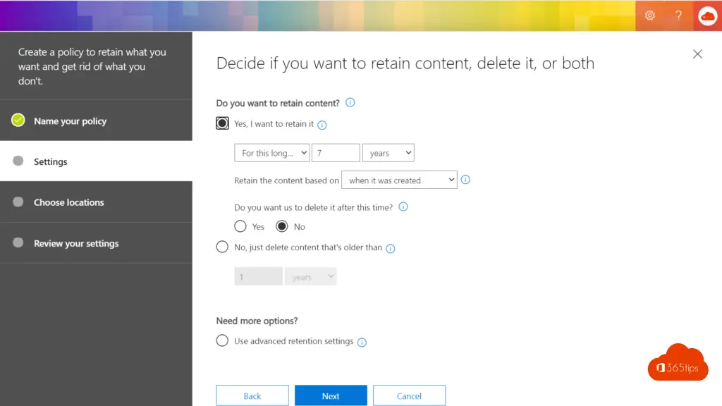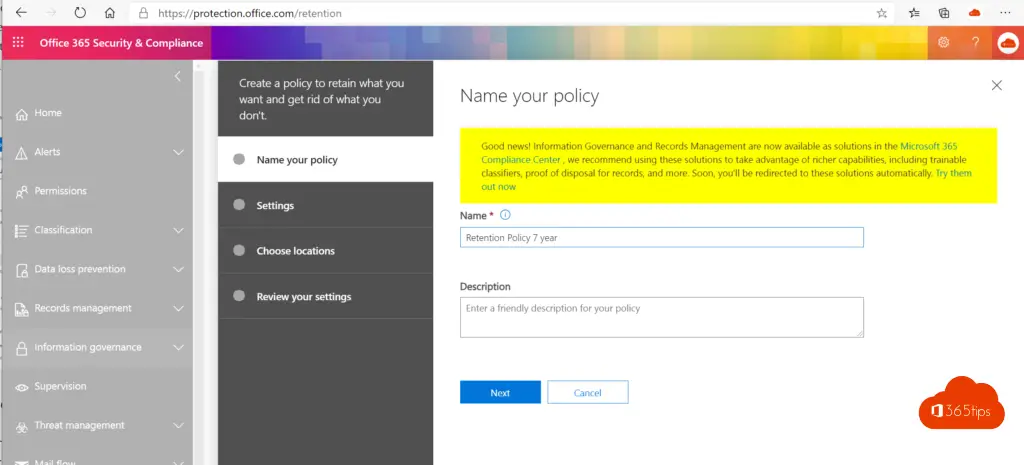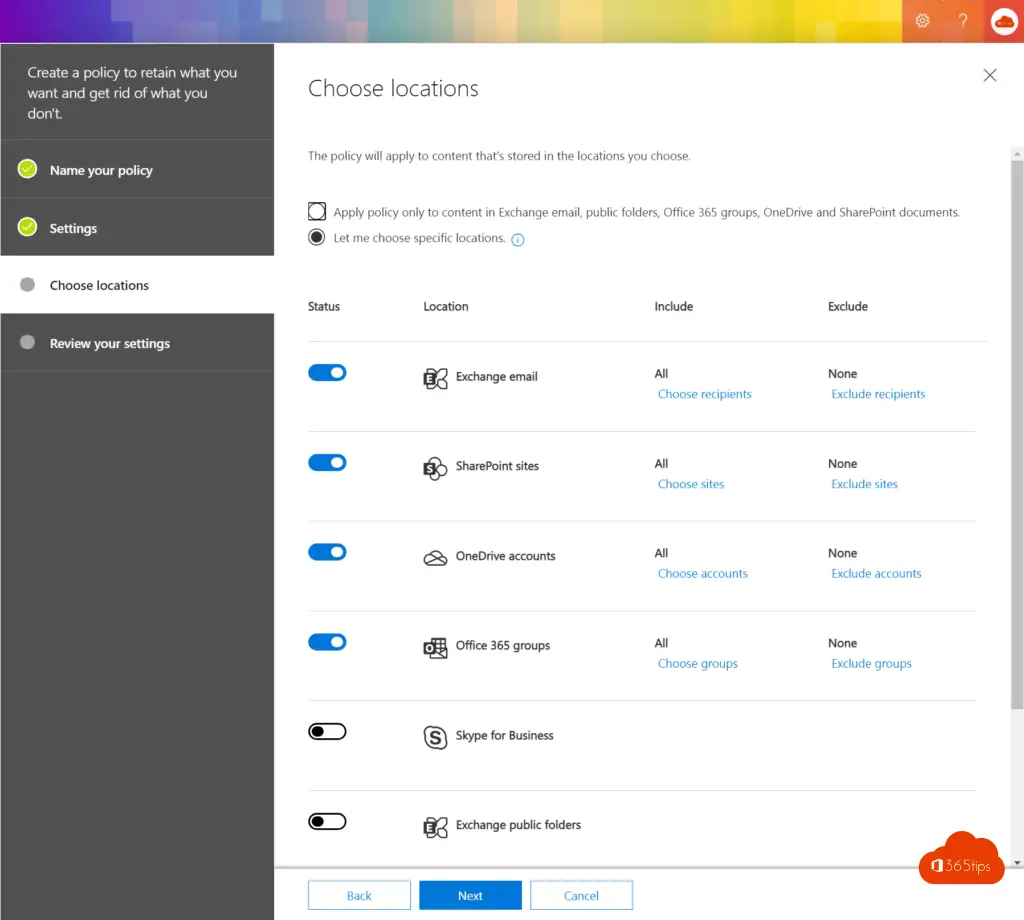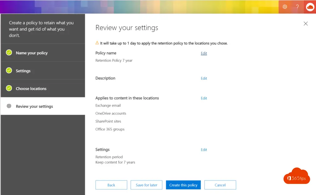 - Het is verstandig een aparte retention policy te maken voor alle locaties. (behalve groepen & kanalen- deze is al gemaakt)