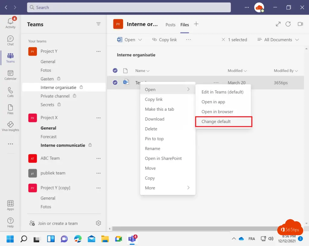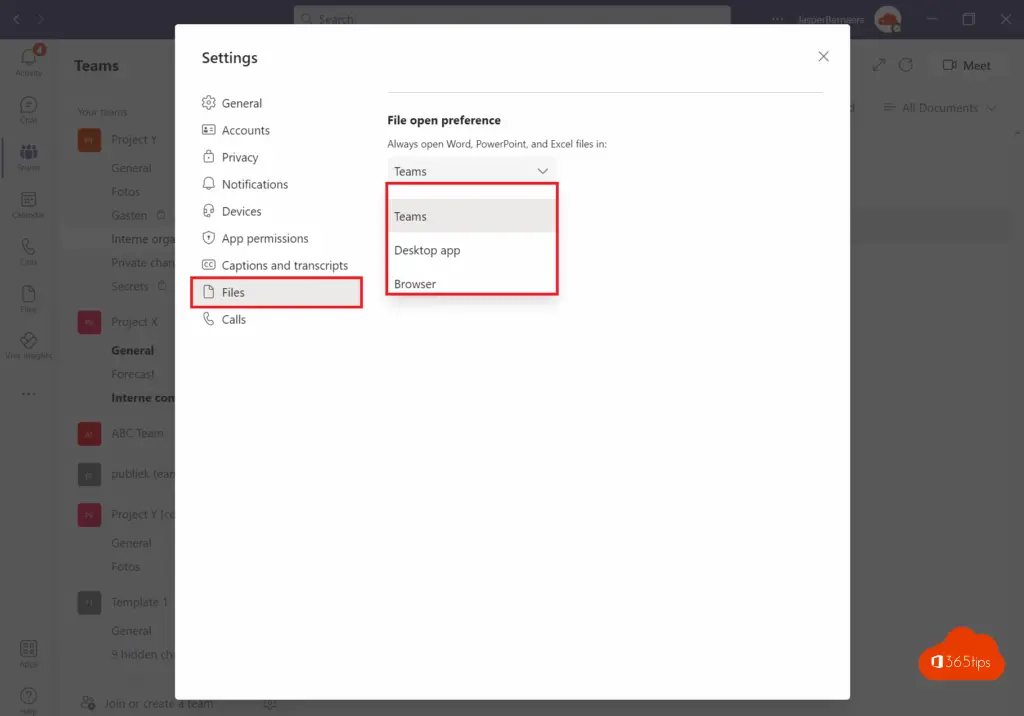 Via de standaard-instellingen in de bestanden-tab kan je in Microsoft Teams ook het gedrag van het voorkeursprogramma aanpassen.