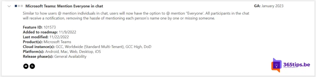 In deze Microsoft 365 roadmap kan je informatie raadplegen over Microsoft Teams maar ook over: Excel, Microsoft Edge, Forms, OneDrive, Stream, Visio, Whiteboard, etc. Bekijk zeker deze pagina: Microsoft 365 Roadmap | Microsoft 365.