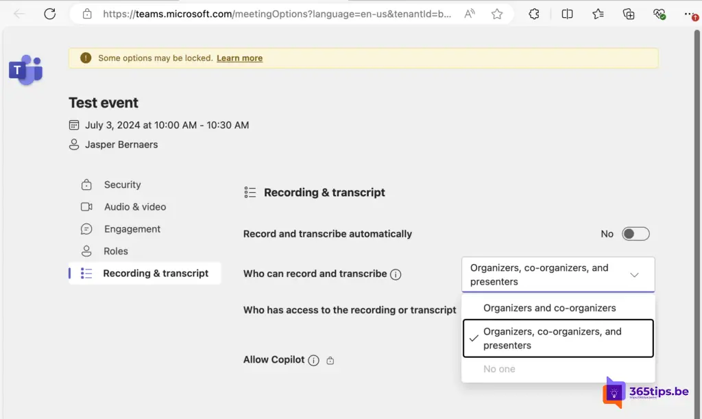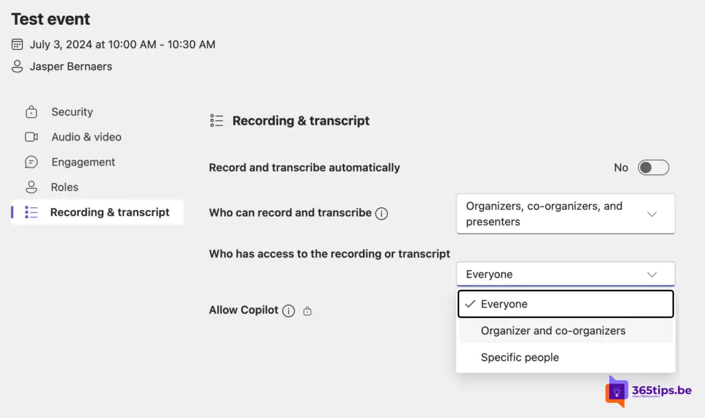 - Tijdens en Na de Vergadering: Organisatoren kunnen nu bepalen wie toegang heeft tot opnames, transcripties, AI-notities in Intelligent Recap en Copilot. Dit zorgt ervoor dat gevoelige informatie privé blijft en alleen toegankelijk is voor de mensen die het echt nodig hebben.