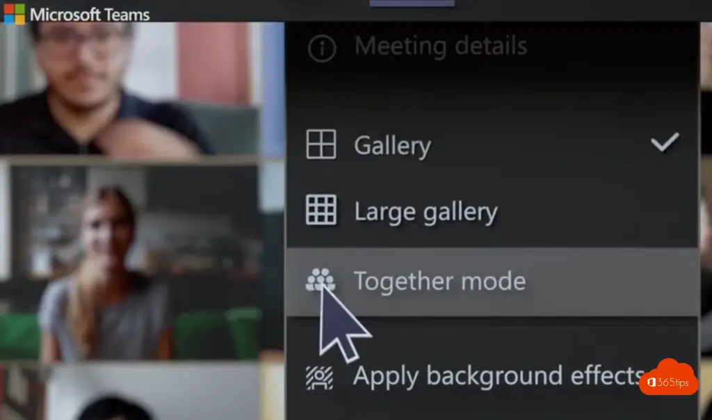 - De modus samen werken biedt u de mogelijkheid net alsof u zich in dezelfde gedeelde ruimte bevindt als iedereen in de vergadering. Het staat in hetzelfde menu als de grote galerie, net eronder.