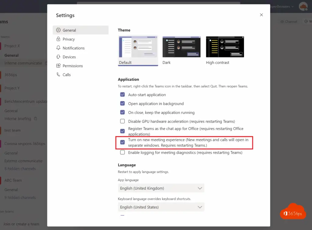 Nieuwe vergaderingservaring inschakelen (nieuwe vergaderingen en oproepen worden in afzonderlijke vensters geopend. Vereist opnieuw starten van Teams.)