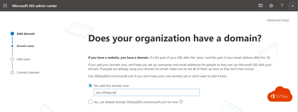 Als je de eerste keer inlogt in https://portal.office.com dien je 2 zaken te doen. Je domein toevoegen zodat je e-mails kan versturen met je domein en de configuratie van Office 365 voltooien.
