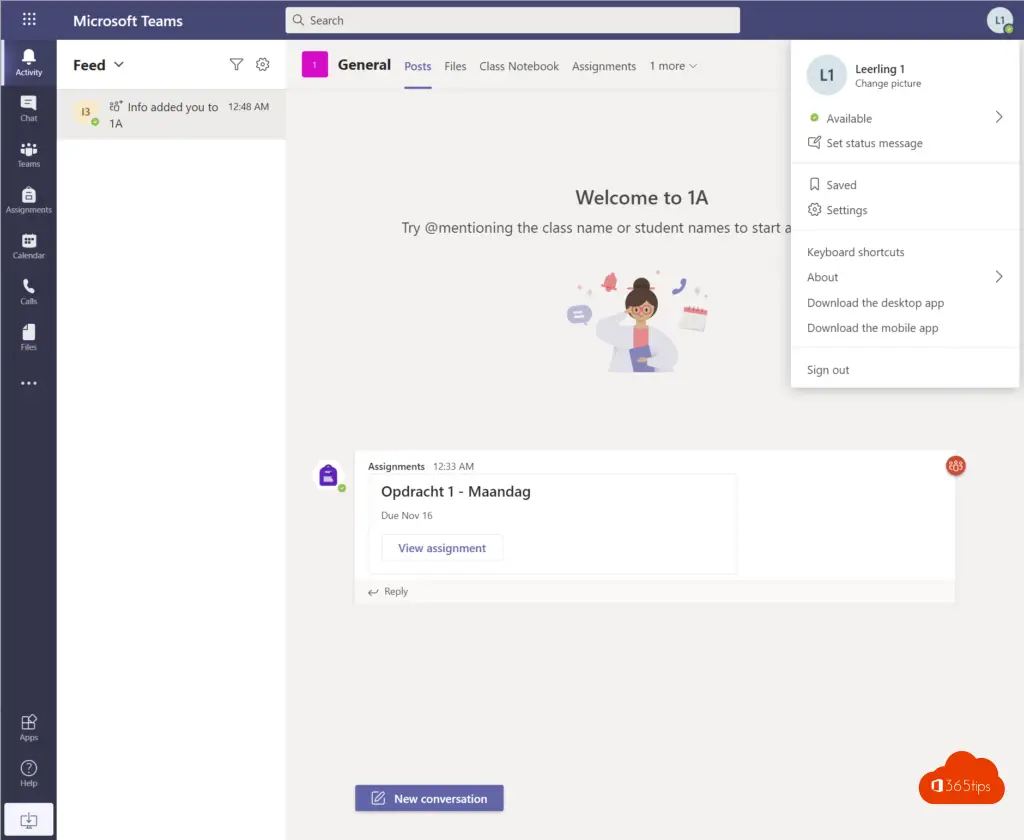 Leerling 1 krijgt bij de eerste aanmelding op https://teams.microsoft.com een melding dat hij is toegevoegd aan de klas en kan zijn taken raadplegen.