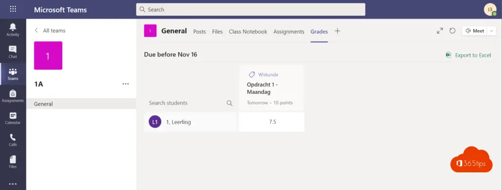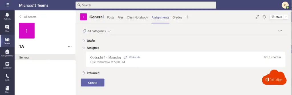Via de bovenstaande stappen maakte we een taak voor alle leerlingen van 1A. Leering 1 is de eerste student toegevoegd aan dit Team.