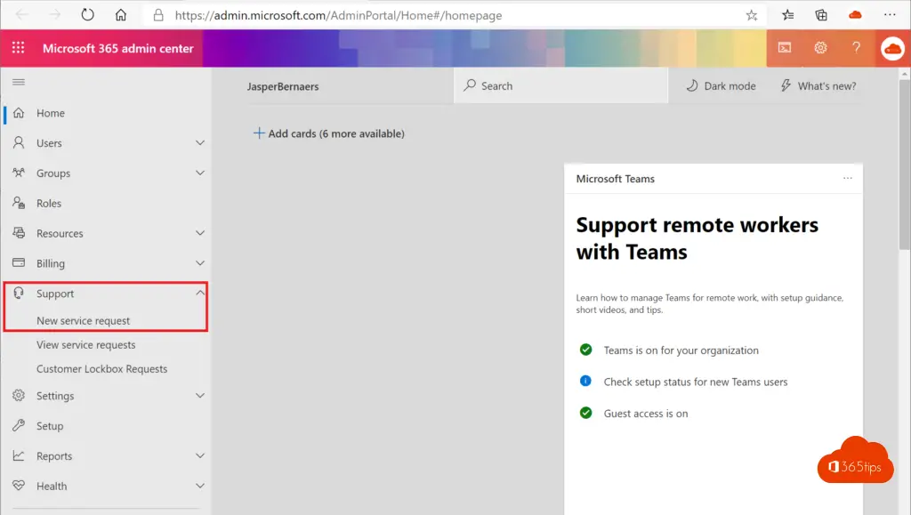 Een nieuwe servicerequest log je via: https://admin.microsoft.com/
