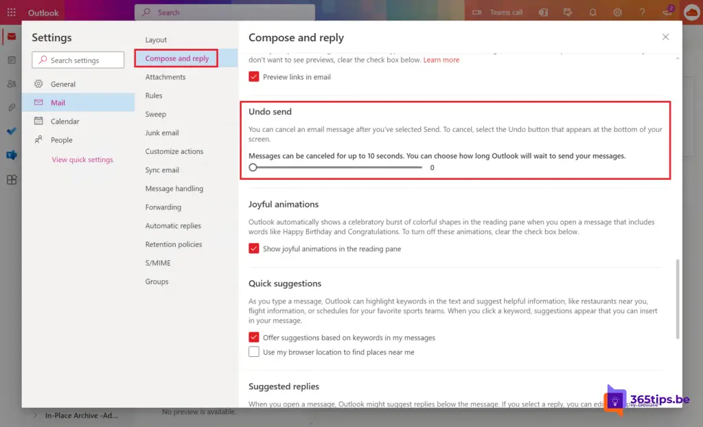 Activeer de optie: Undo Send in Exchange Online — Outlook Web Access. Druk vervolgens op opslaan.