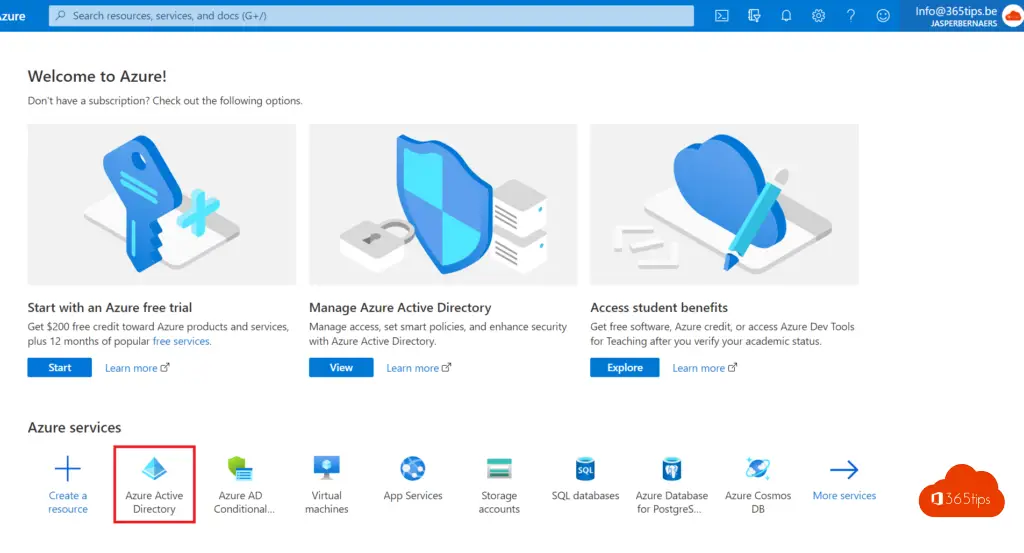 Een Microsoft Team herstellen uit de prullenbak van Microsoft Azure. -> Surf naar het Azure Portaal -> Druk op Active Directory.