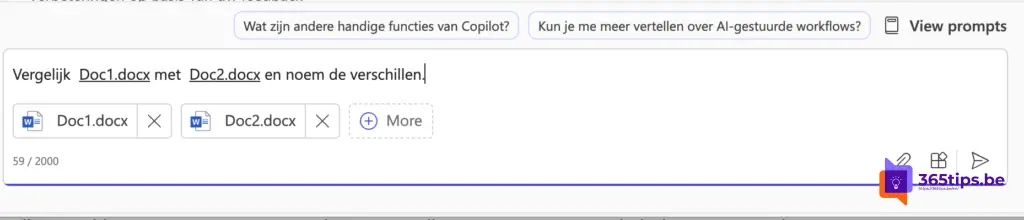 - Vergelijk Documenten: Verbeter uw vermogen om te beoordelen en kwaliteits- en versiecontrole te bieden met de bestanden die u in uw workflows gebruikt. Vraag Copilot om twee verwezen bestanden te vergelijken en de verschillen tussen hen op te lijsten. Dit is vooral handig voor het vergelijken van meerdere contracten, artikelen of voorstellen.