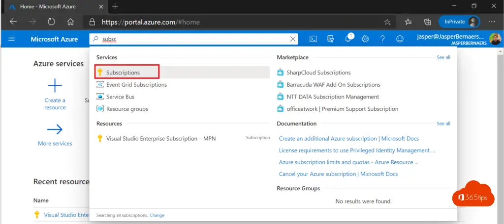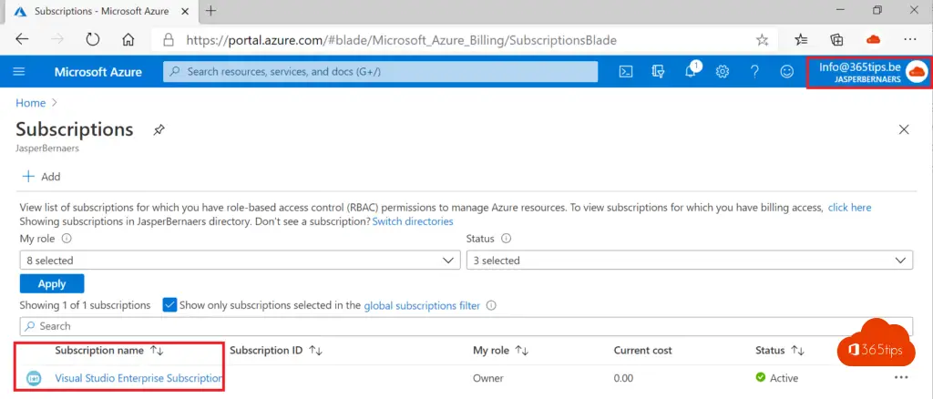 Druk op de naam van de subscriptie, in dit geval gebruik ik een test MSDN-subscriptie.