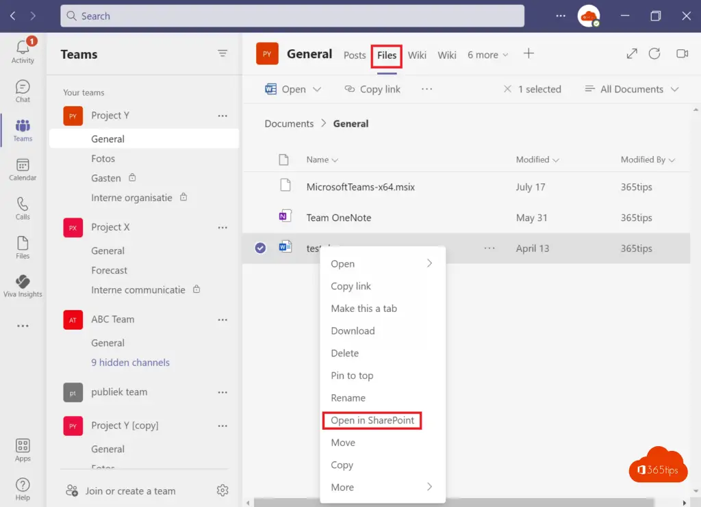 Zoek het bestand dat u wenst te herstellen. Navigeer naar het gewenste Teams, selecteer vervolgens bestanden en kies Open in SharePoint.