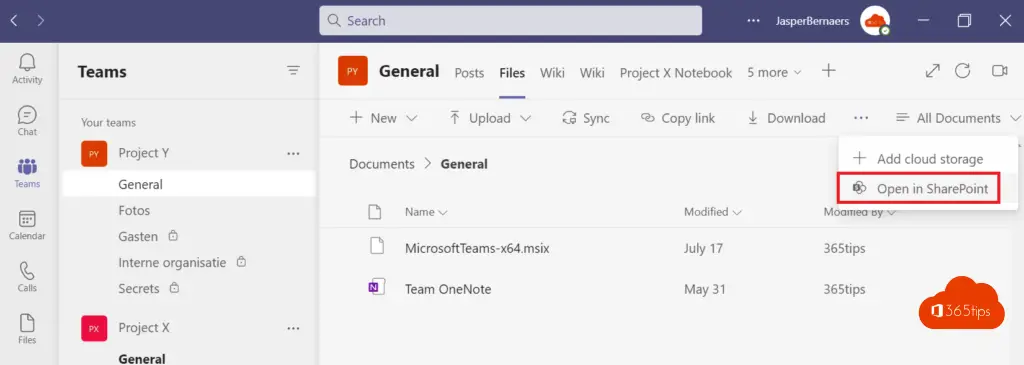 Selecteer -> Open in SharePoint om de onderliggende bibliotheek te raadplegen. Hierin zijn alle verwijderde bestanden 30 dagen opgeslagen.