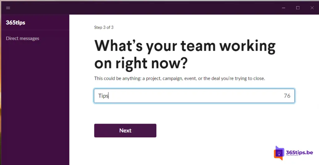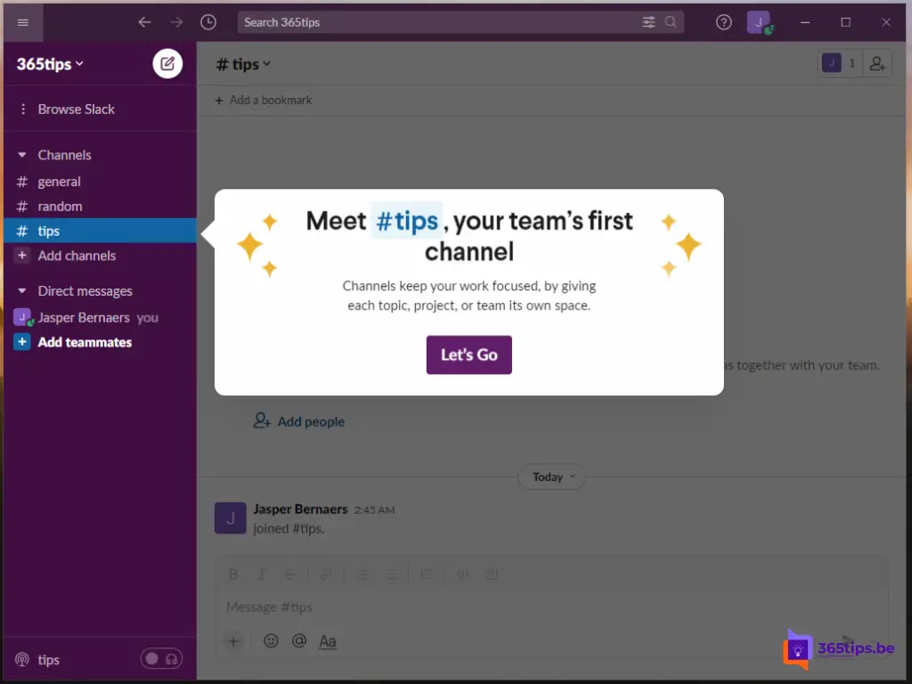 Als je een kanaal wenst aan te maken kan je via de wizard aan de slag. Ik noem mijn test Slack kanaal: Tips.